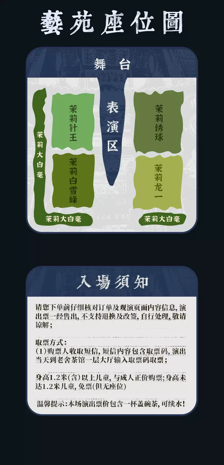 2、购票须知:1、成年节目1.2米及以下儿童谢绝入场(Children under 1.2m will not be admitted, except in performances for children.)。2、亲子儿童节目儿童一律凭票入场。请您谨慎购票,一经出票不退不换,望您知晓!