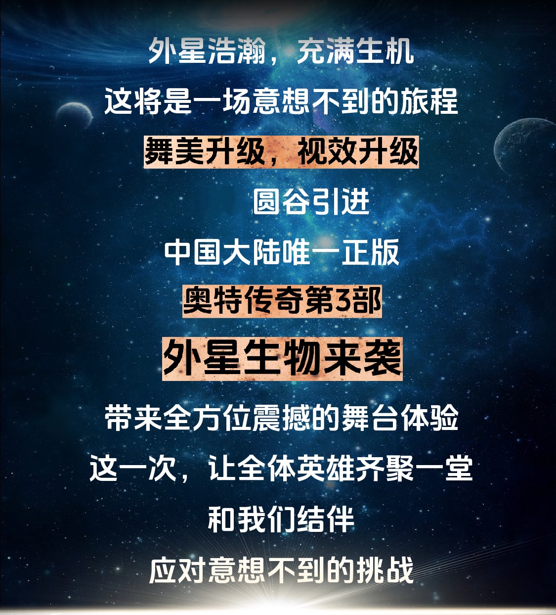 购买“380元档”演出票赠送小朋友与奥特曼合影机会一次。演出结束后,每10位小朋友为一组上台合影(无单独合影),由家长或同伴自行拍照,现场听从工作人员组织安排,有序参加。