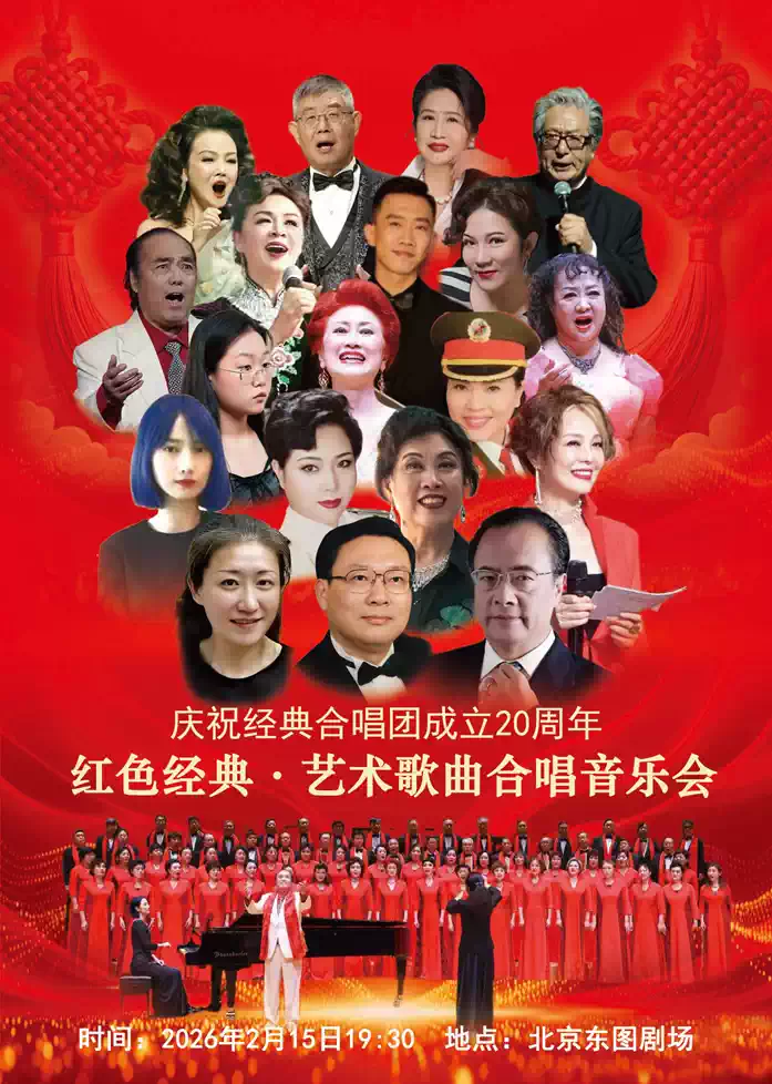 为了庆祝中国音协合唱联盟经典合唱团成立20周年,2026年2月15日19:30,在北京东图剧场,将隆重上演“红色经典·艺术歌曲合唱音乐会”。这是经典合唱团20周年团庆系列音乐会的首场演出,演出团体派出了最强阵容:国家一级演员、著名男高音歌唱家李初建出任艺术总监,中央歌剧院一级演员,著名男中音歌唱家王立民担任主持并演唱,知名歌唱家岳彩帼、谢一曼、詹夕、赵小华、马崇友、李红军、杨桂华、侯梅、邹巧玉、章英、刘影、方新、孙兴礼、马玉亮等将献上各自的保留曲目。深受观众喜爱的混声合唱,由著名青年指挥家李默然执棒,青年钢琴家王兆兴、刘娣、胡馨丹钢琴伴奏。
