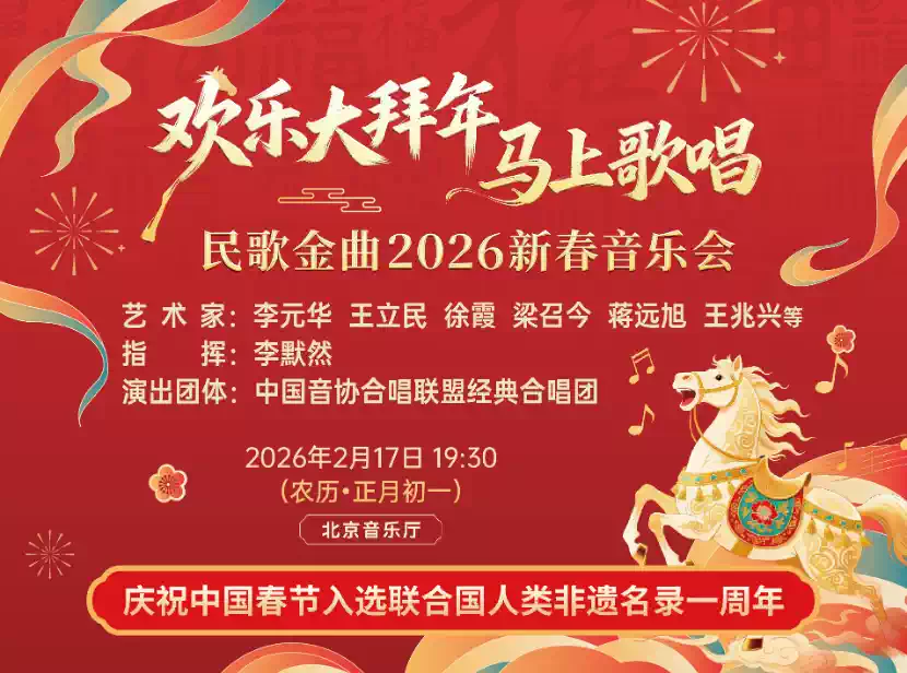 当乙巳岁末的钟声渐远,丙午马年的蹄音踏春而来;当中国春节申遗成功一周年的荣光与新春的喜庆撞个满怀,一场浸润着中华文脉、流淌着人间烟火的民歌盛宴,即将于北京音乐厅璀璨启幕。2026年2月17日(农历正月初一)19:30,“欢乐大拜年•马上歌唱——民歌金曲2026新春音乐会”邀您与家人共赴一场年味儿与艺术交织的新春之约。
