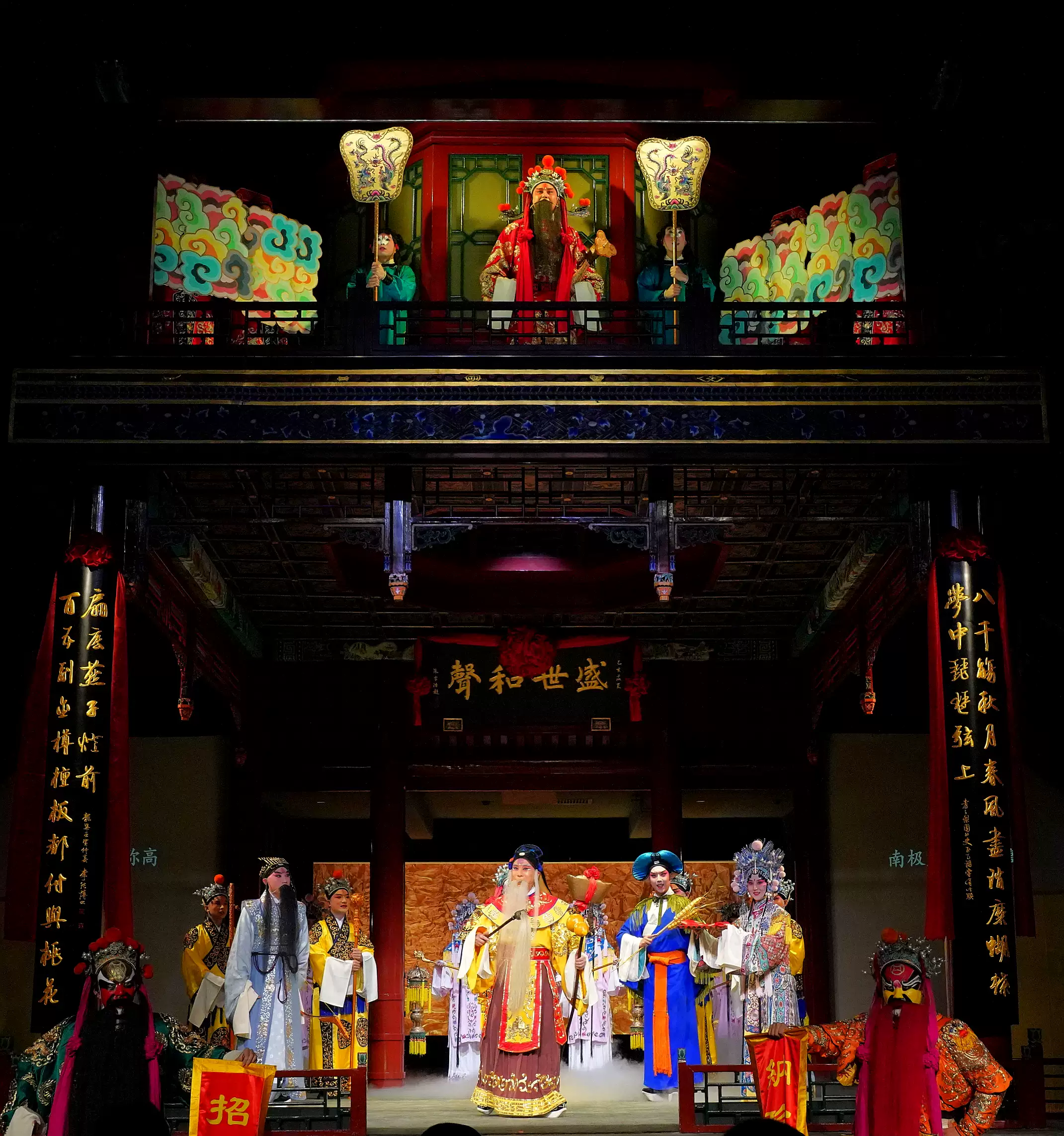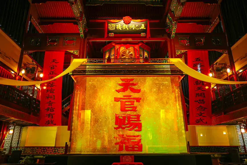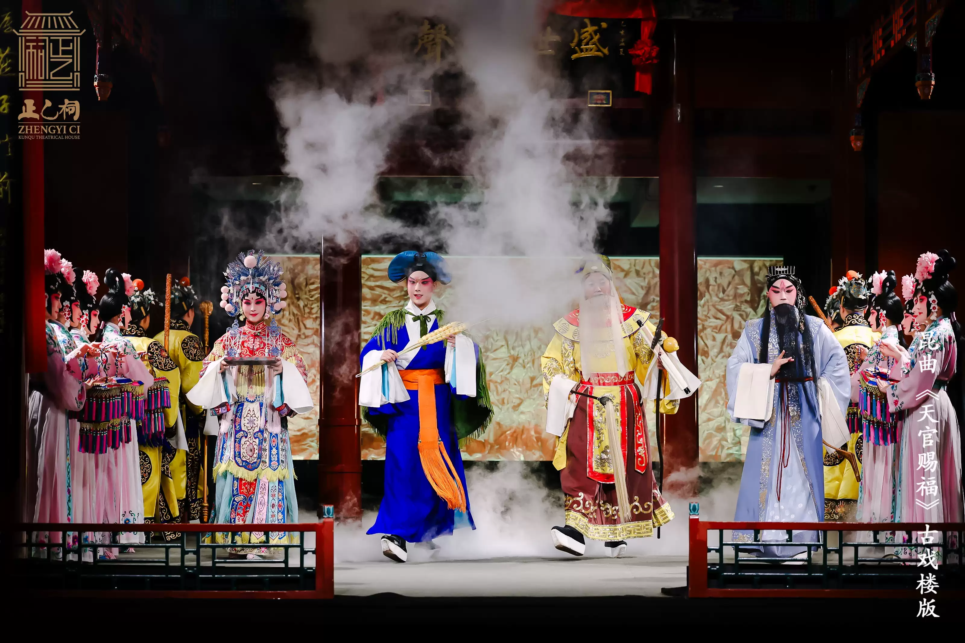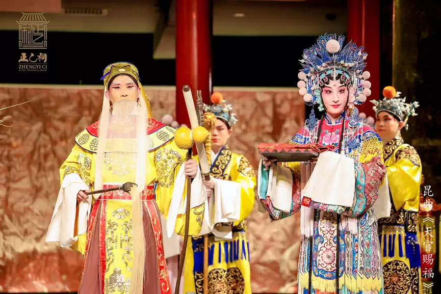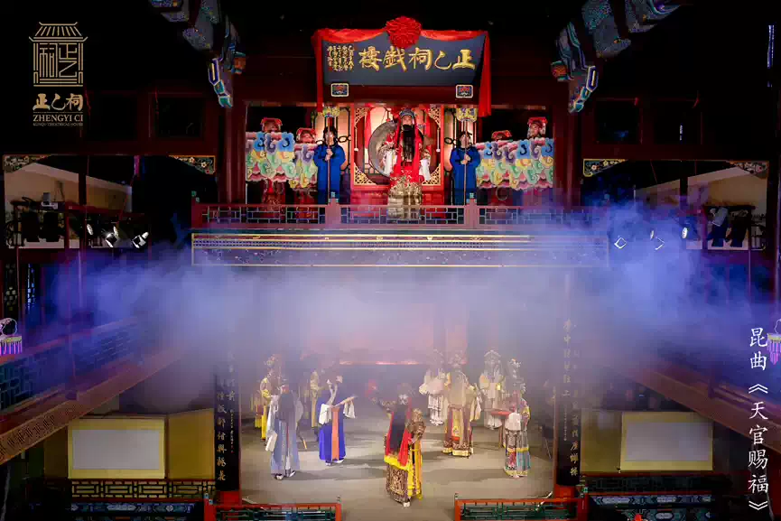 正乙祠前身乃明代之财神庙,供奉正乙玄坛老祖,即 “正财神” 赵公明,此乃“正乙祠”之名由来。今演《天官赐福》,此乃古今之妙合,祥瑞之叠加。戏楼之古韵,昆曲之雅韵,与祈福之愿韵,相融相和,相得益彰。