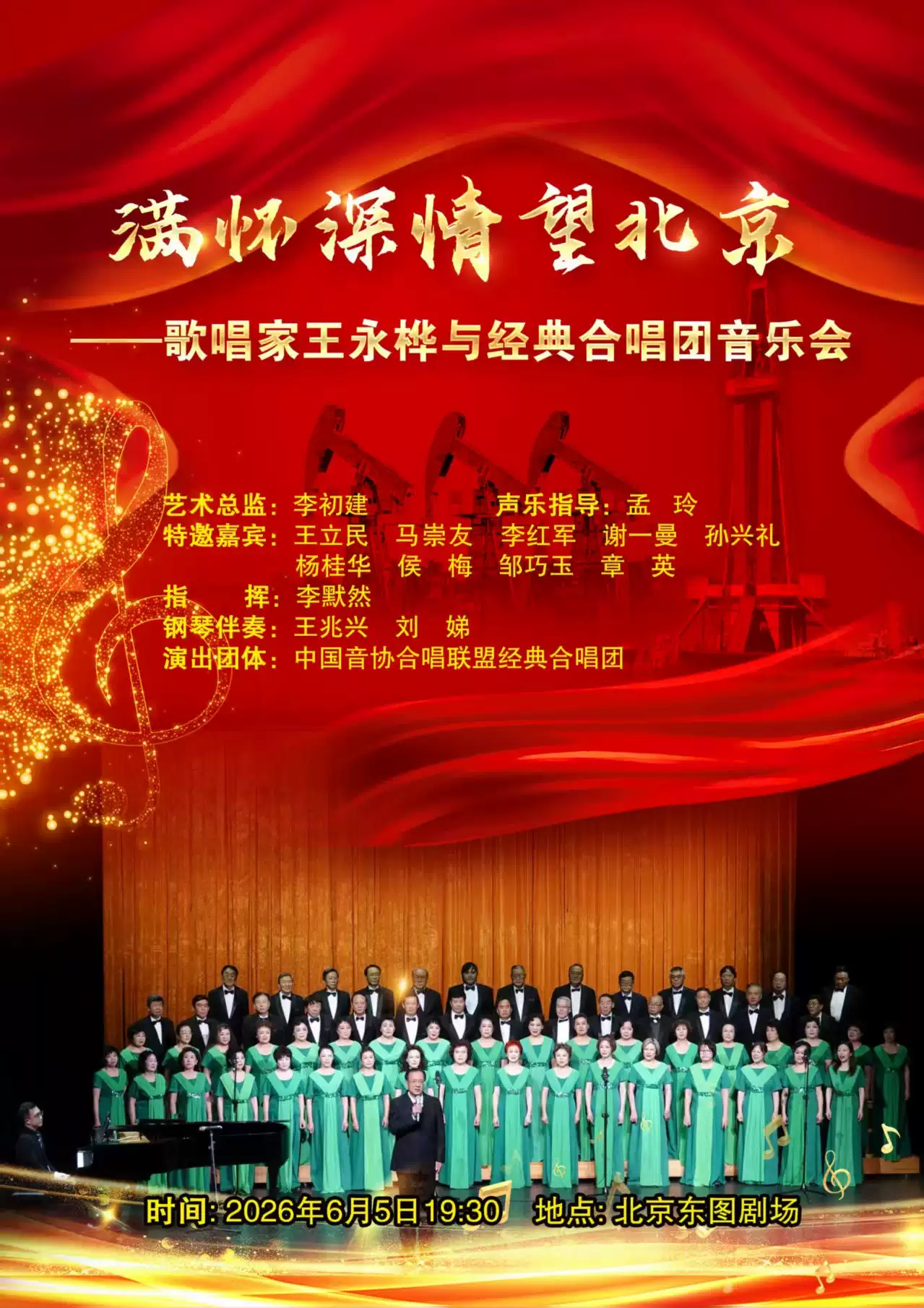 为庆祝中国音协合唱联盟经典合唱团成立20周年,2026年6月5日19:30,在北京东图剧场,将隆重上演“满怀深情望北京——歌唱家王永桦与经典合唱团音乐会”。这是继“红色经典·艺术歌曲合唱音乐会”在东图剧场演出大获成功后,经典合唱团20周年团庆系列音乐会的第三场演出。演出团体派出了最强阵容,与著名男高音歌唱家王永桦携手,将为观众献上的又一场精彩音乐会。国家一级演员、著名男高音歌唱家李初建出任艺术总监,原解放军艺术学院教授、著名声乐教育家孟玲担任声乐指导,中央歌剧院一级演员,著名男中音歌唱家王立民担任主持人。曾两次在中央电视台青年歌手大奖赛中获奖的著名男高音歌唱家王永桦,将在大型合唱团的烘托下,领唱、独唱多首经典歌曲。曲目除了他的获奖歌曲《老松树》《再铸时代铁脊梁》外,王永桦还将倾情演唱《满怀深情望北京》《北京颂歌》《长城永在我心上》《我像雪花天上来》《把一切献给党》等人们耳熟能详、演唱难度大的男高音歌曲。经典合唱团歌唱家谢一曼、马崇友、李红军、杨桂华、侯梅、邹巧玉、章英、孙兴礼、高明、马玉亮等将加盟助演,他们献上的曲目形式多样,丰富多彩。特别值得期待的是,经典合唱团近来原创和改编的一组混声合唱《和长城握手》《马儿啊你慢些走》《感恩》等,将集中亮相,相信会给广大的合唱爱好者带来全新的艺术感受。深受观众喜爱的混声合唱,由著名青年指挥家李默然执棒,青年钢琴家王兆兴、刘娣钢琴伴奏。