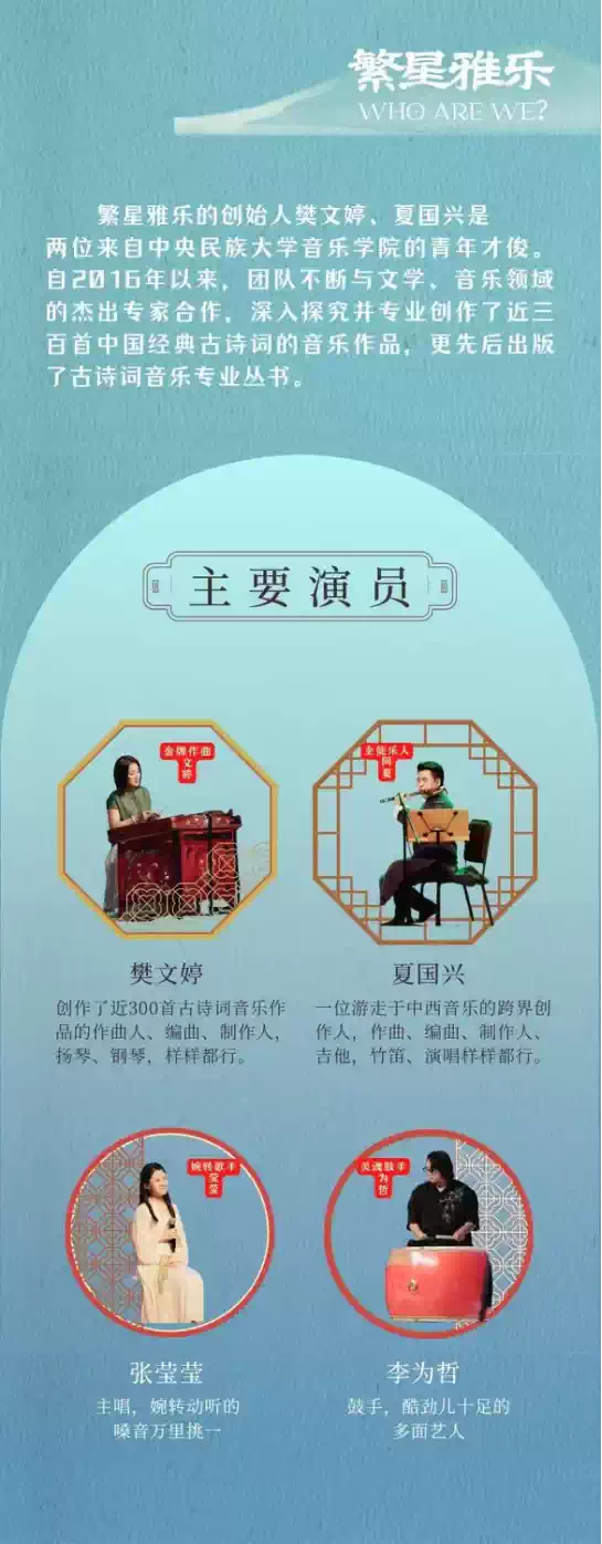 历经十年沉淀,“繁星雅乐”先后原创了近300首古诗词歌曲,于常青藤爸爸App积累百万听众,并随发展需要求拓展至更广泛的诗词爱好者市场。其代表作《醉美古诗词》唱学音乐会的全国巡演已稳步落地,先后登录北京、上海、青岛、厦门等多地。持续传递古诗词原创音乐的独特魅力。这次“繁星雅乐”带来古风民谣专场音乐会,把传统文化融入民谣风格的音乐作品中。不仅有宋词的精心改编,同时也有唐诗的原创音乐,让传统文化的唐诗宋词更加生动,再配合民族器乐的伴奏,使整场音乐会沉浸在古风风格中。