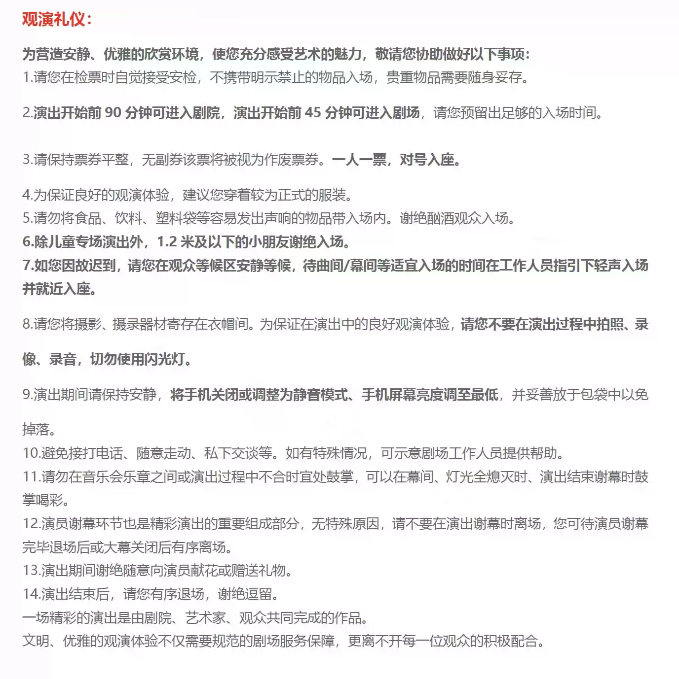 3、购票须知,请您知晓:1、成年节目1.2米及以下儿童谢绝入场(Children under 1.2m will not be admitted, except in performances for children.)。2、亲子儿童节目儿童一律凭票入场。3、因个人原因不能观看演出,一律不退不换!请谨慎下单