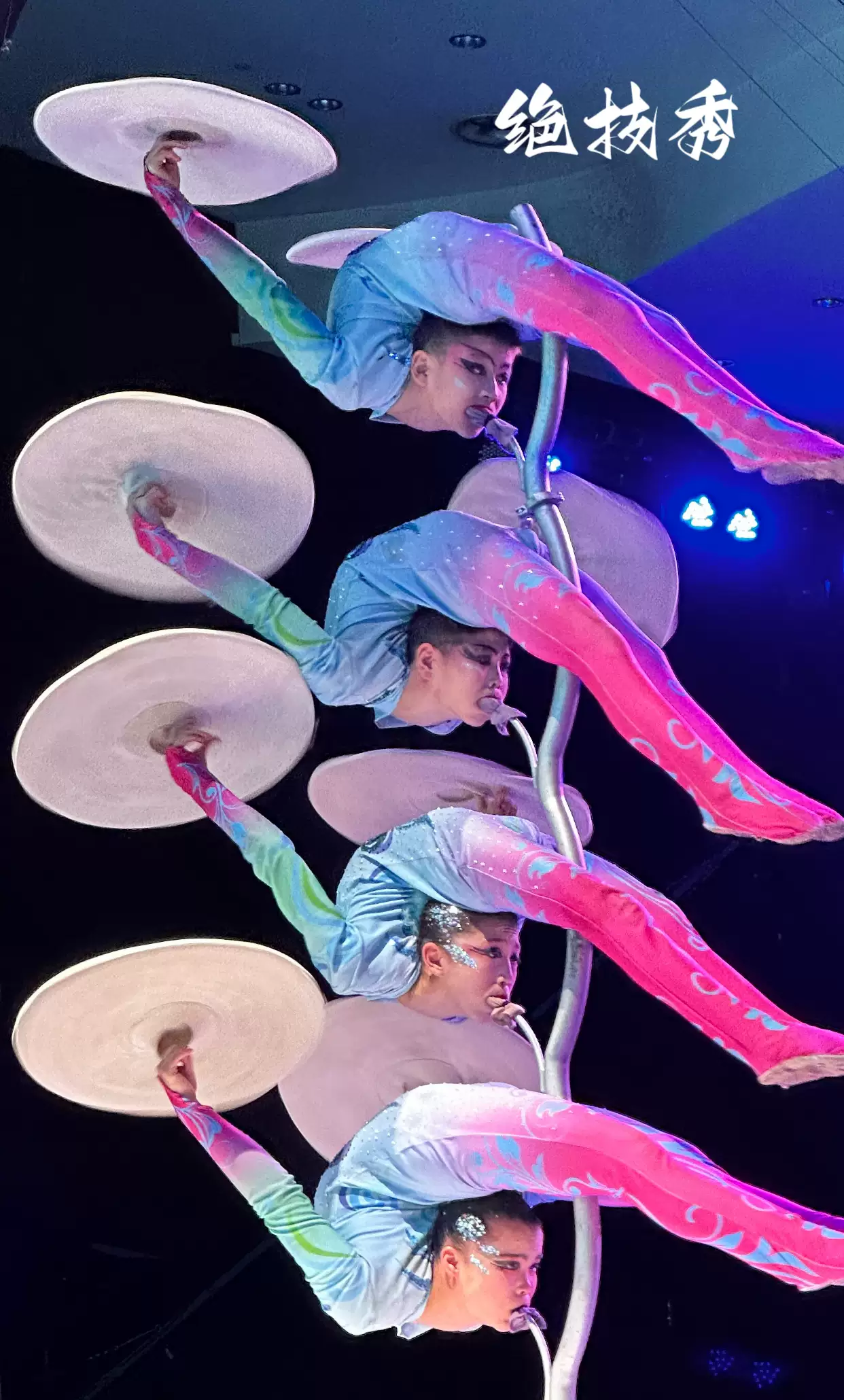 由8个女孩完成,演员用一根长一米,粗如铅笔的竿子顶着碟底,晃动旋转,看上去优美而抒情。