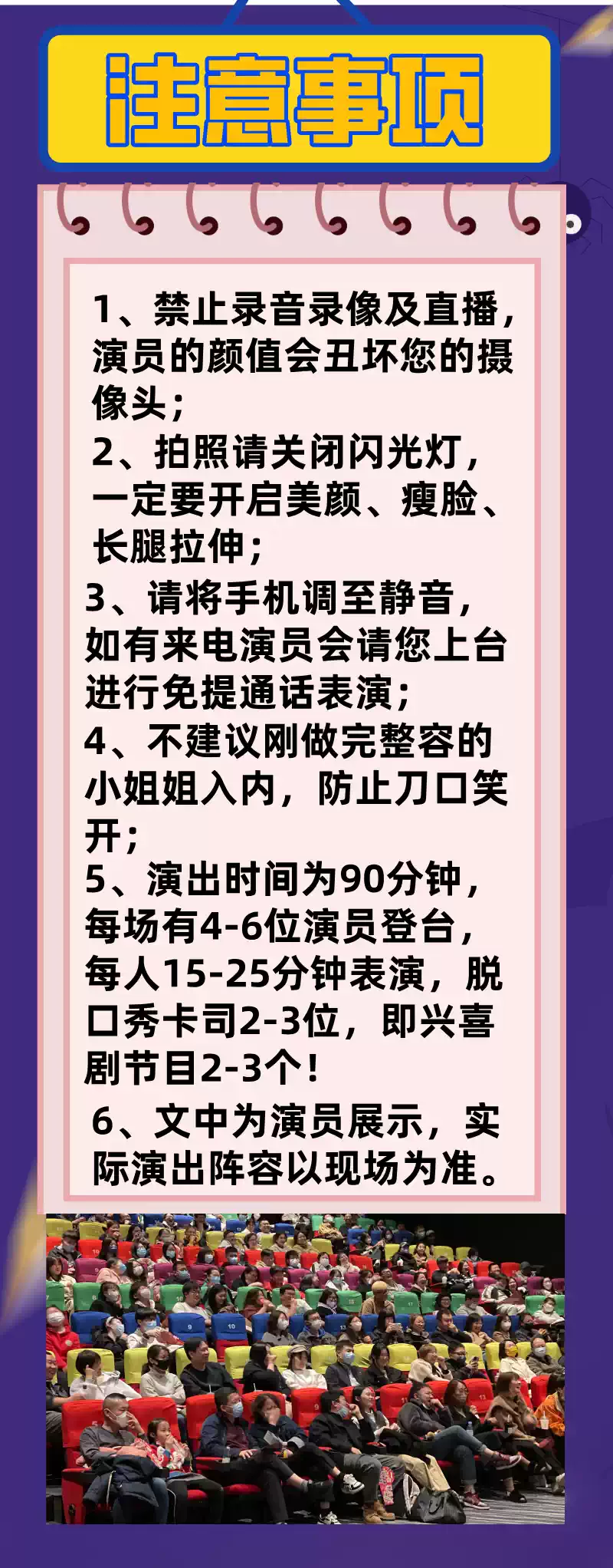 3、购票须知,请您知晓:1、成年节目1.2米及以下儿童谢绝入场(Children under 1.2m will not be admitted, except in performances for children.)。2、亲子儿童节目儿童一律凭票入场。3、因个人原因不能观看演出,一律不退不换!请谨慎下单
